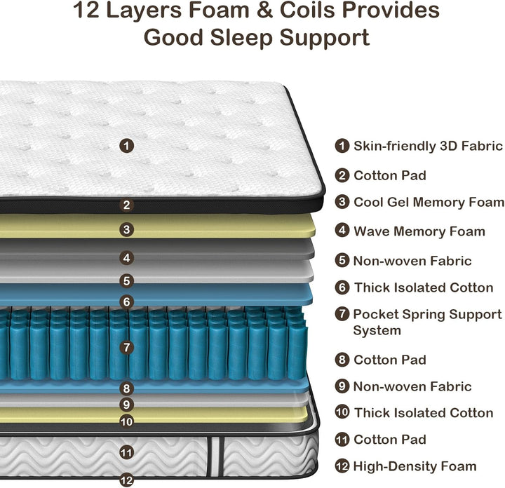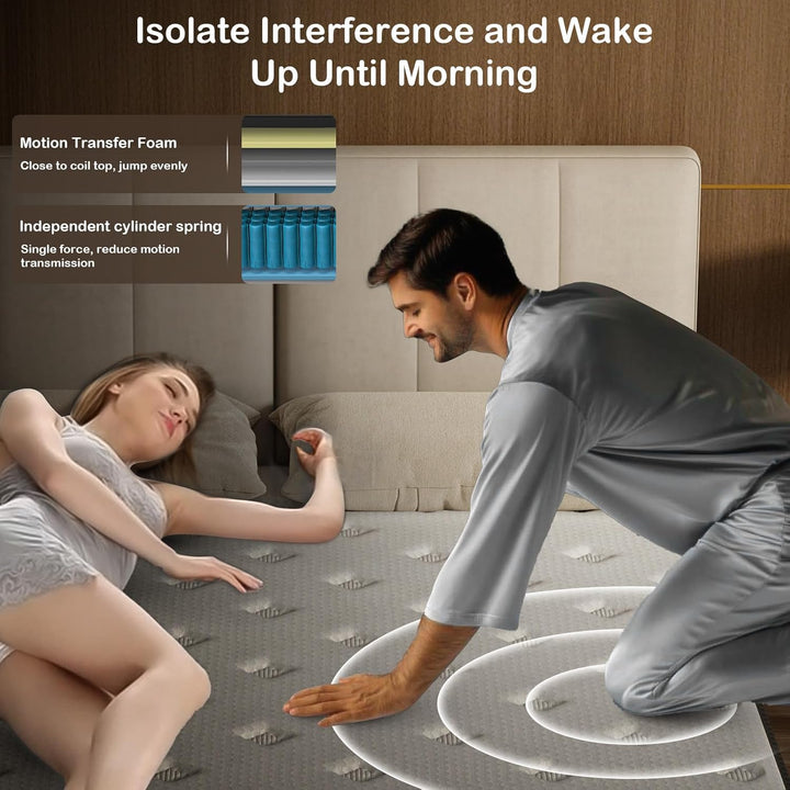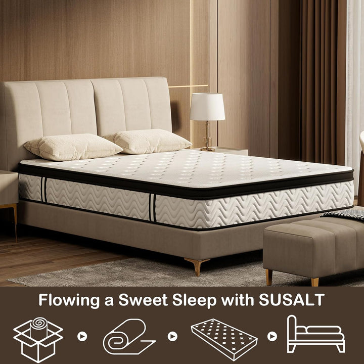【Quietly Step on Dreamland】 The Susalt 12 inch hybrid mattress combines medium-firm memory foam with individual pocket springs and a high-density acoustic layer to further block out any tiny sounds. Effectively absorbs and eliminates possible noise. Whether you're sleeping with your pet or sleeping with your partner, moving and turning over in bed won't affect each other. Make every night so peaceful and comfortable, wake up your body
