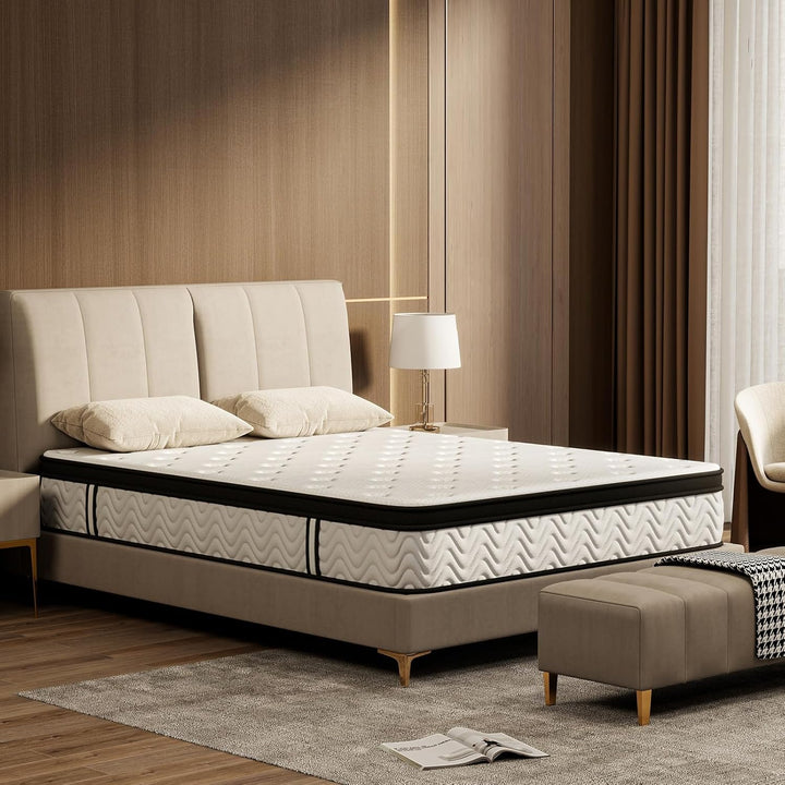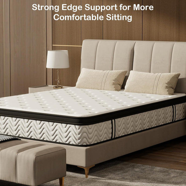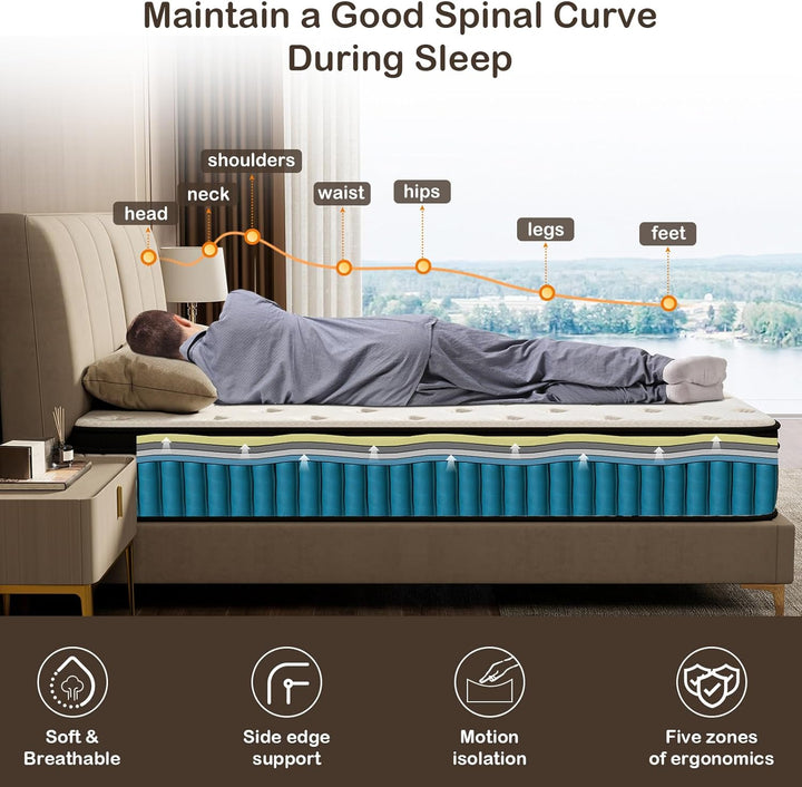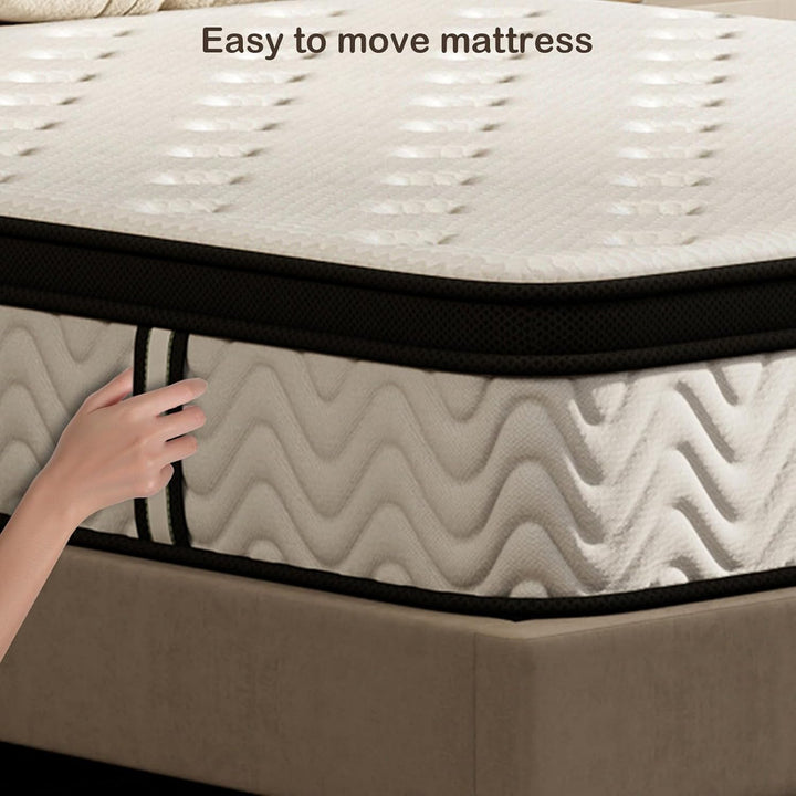 【Sleep However You Want】 The black and white hybrid mattress features a stylish peak pattern, showcasing a fashionable, avant-garde design. With seven ergonomic zones and adaptive spring strength, it effectively relieves muscle pressure. Over 600 springs provide point-to-point support, maintaining your spine's natural curve. This optimal support not only alleviates existing back discomfort but also prevents potential spinal issues, ensuring a comfortable and healthy sleep experience.