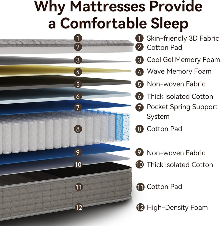 【Sleep Peacefully】Enjoy a peaceful, undisturbed night's sleep. The Susalt 12" Queen Mattress combines medium-firm memory foam with pocket springs to reduce sound transmission. Whether you sleep with your pet or partner, you can move and toss in bed without interrupting each other. This innovative design allows you to indulge in a deep, undisturbed sleep, so you can experience true peace and relaxation every night.