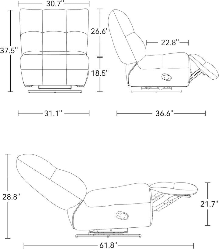 【Your Freedom Space】-- The recliner is spacious and comfortable, allowing you to fully stretch out and relax. The armless design gives you more freedom. Measuring 31.1 inches in width, 36.6 inches in depth, and 37.4 inches in height